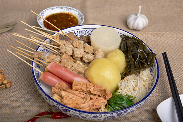 牛杂串是广东湛江著名的传统小吃,属于粤菜系。最关键的是那煲滚烫浓香的酱汁,里面除了面酱之外,八角、茴香、花椒、陈皮等各种香料是必不可少的。牛杂串是孩子们最喜爱的小食之一。当北方寒潮南下,天上飘着毛毛细雨时,赤坎的横街窄巷便飘起了一阵阵煮牛杂串的香味来。