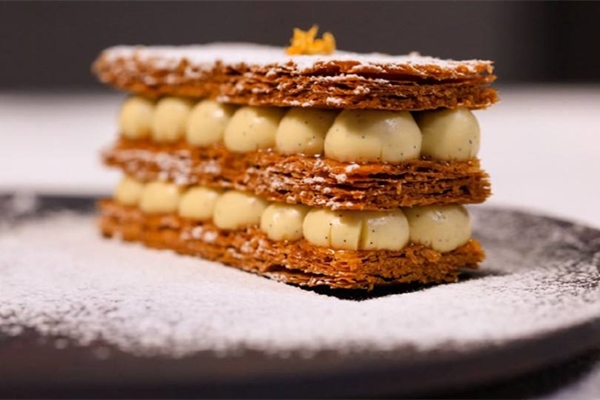 千层酥,是烘焙类点心,因烤好出后侧面可见许多分层得名,口感酥酥脆脆、香浓甜美。根据不同品味做法种类繁多。