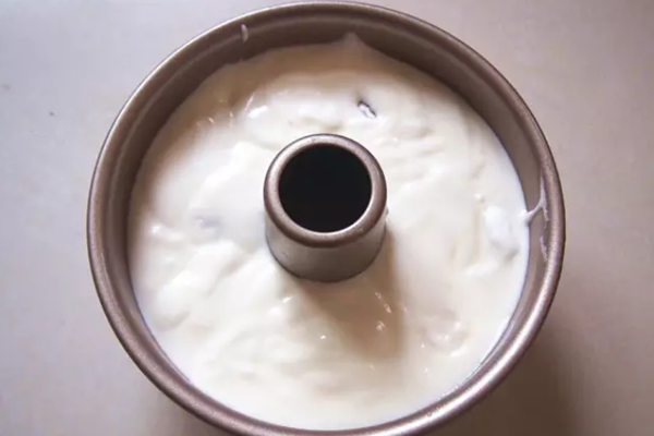 将混合好的蛋糕糊倒入模具中,轻震两下磕出里面大气泡。