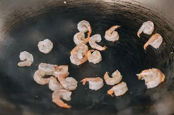 大火热锅,倒入一勺油,待油热好,倒入虾仁,炒至表面变粉红色,虾肉呈半透明状,盛出。