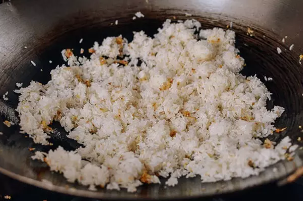 然后将剩饭倒入锅中,和姜蒜末一起翻炒均匀。